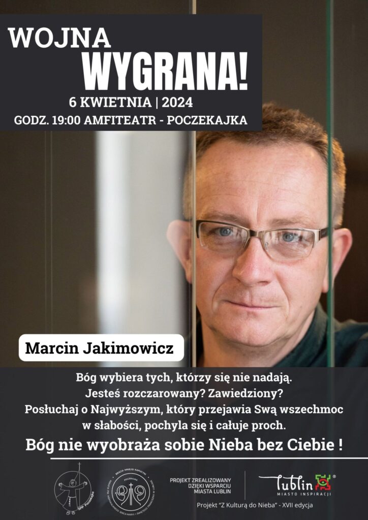 Marcin Jakimowicz z wykształcenia prawnik z zawodu dziennikarz, pracował jako korespondent Katolickiej Agencji Informacyjnej, redaktor “Gościa Niedzielnego” oraz wydawnictwa Księgarnia Św. Jacka, autor kilku książek, a także lider wspólnoty modlitewnej na katowickim Józefowcu, mąż Doroty, tata Marty, Łukasza i Nikodema. Niektórzy mieli przyjemność wysłuchać Jego konferencji w zeszłym roku w Serpelicach w czasie „Golgoty Młodych”.